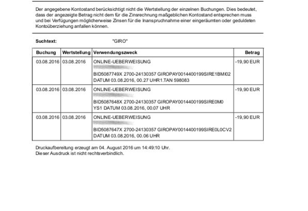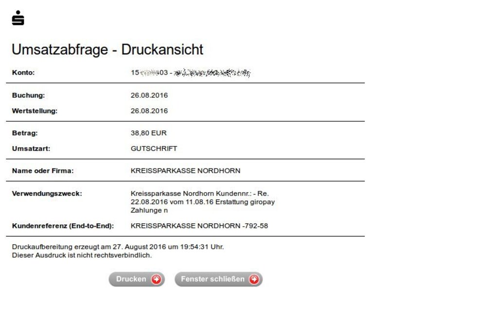 die, von der sparkasse nordhorn zugesagte gutschrift erreicht mich am 26.08.2016 ( kto-auszug ). dafür - vielen dank. allerdings und das mal als hinweis nebenher: 19,90 Euro x 2 oder 19,90 Euro + 19,90 Euro hat noch nie 38,80 Euro ergeben.